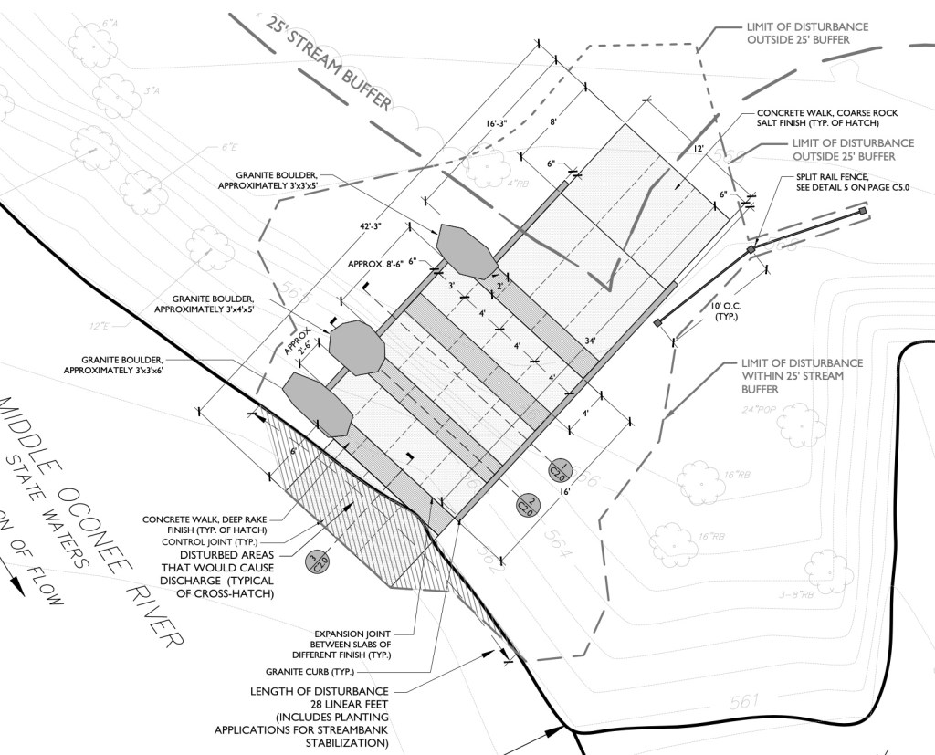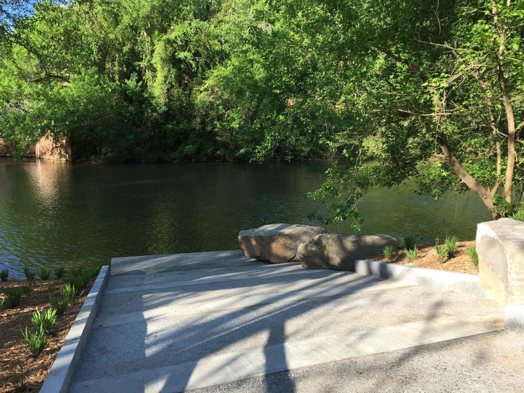 This river trail access point provides a focal point for water users of all stripes, including anglers and dog walkers, as well as those just interested in watching the water. Carefully placed boulders transform a piece of functional infrastructure into a contemplative, garden-like moment along the river bank.
