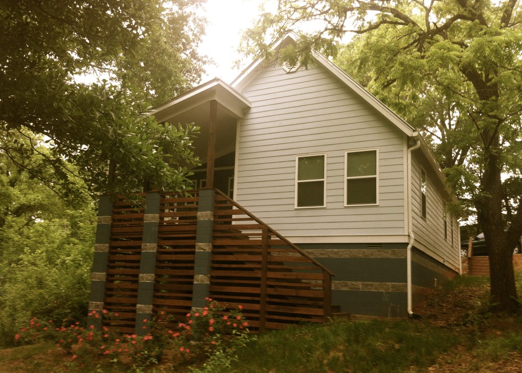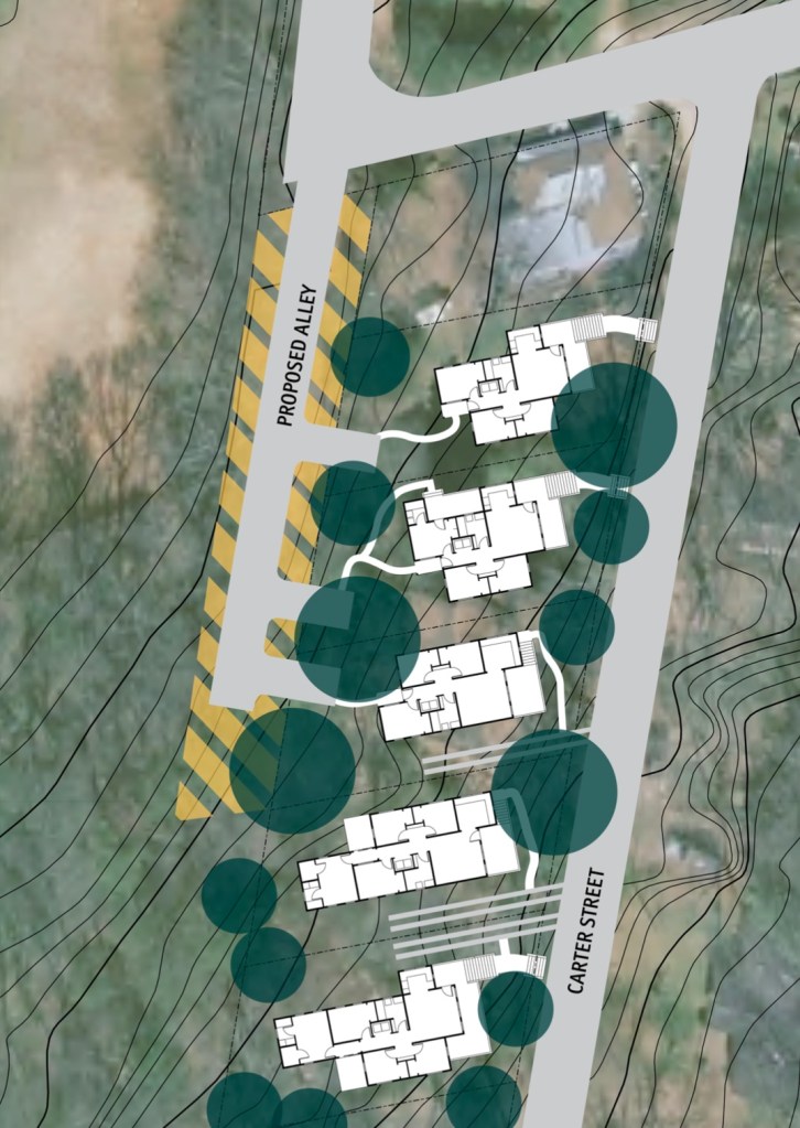 Modular architectural prototypes for a community of five affordable houses on challenging intown lots. The design strategy embraces vernacular building patterns in the area and provides high ceilings with generous eaves, allowing owners to grow their house along with their families. Careful patterning of CMU and other affordable materials helps to create a sense of vibrancy and reduce the scale of the houses on the steep slopes they occupy.